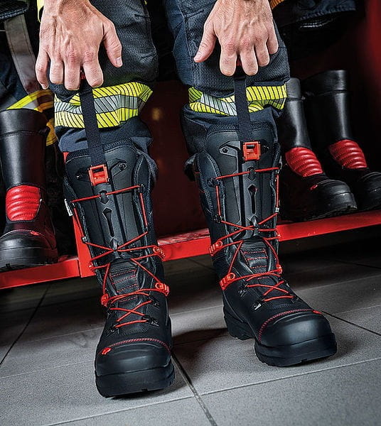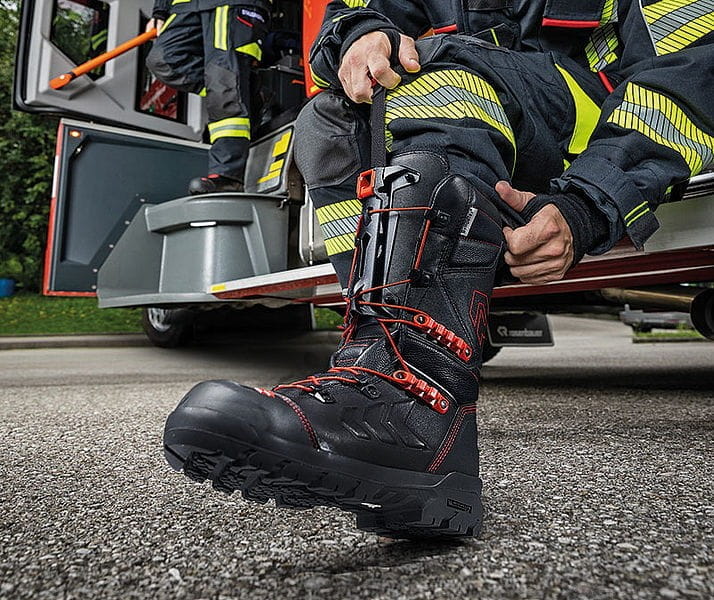 Obuwie bojowe BOROS B4 z innowacyjnym systemem dopasowania firmy Rosenbauer. Pod względem bezpieczeństwa i trwałości wszystkie modele BOROS mają identyczne właściwości i są certyfikowane zgodnie z normą europejską EN15090: