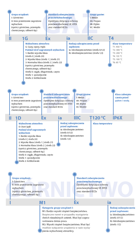 | Zabezpieczenie przeciwwybuchowe | Gaz: II 1G Ex ia IIC T4 Pył: II 1D Ex ia IIIC T120 °C IP6x Górnictwo: I M1 Ex ia |