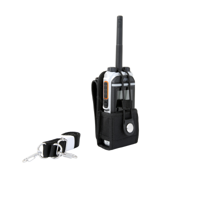 Pokrowiec z mocnego syntetycznego materiału z skórzanym odpinanym ( zatrzaski ) mocowaniem do pasa + pasek naramienny